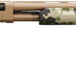 This model comes equipped with internal choke tubes on a Mobil thread pattern, including Full, Modified, Improved Modified, and Improved Cylinder tubes. The synthetic camouflage stock includes checkering and is fitted with a recoil pad. Sling swivel studs are standard, and a fixed fiber optic sight aids target acquisition. The combination of durable synthetic furniture and weatherproof Cerakote finishing makes this pump-action shotgun suitable for hunting and sport shooting applications.