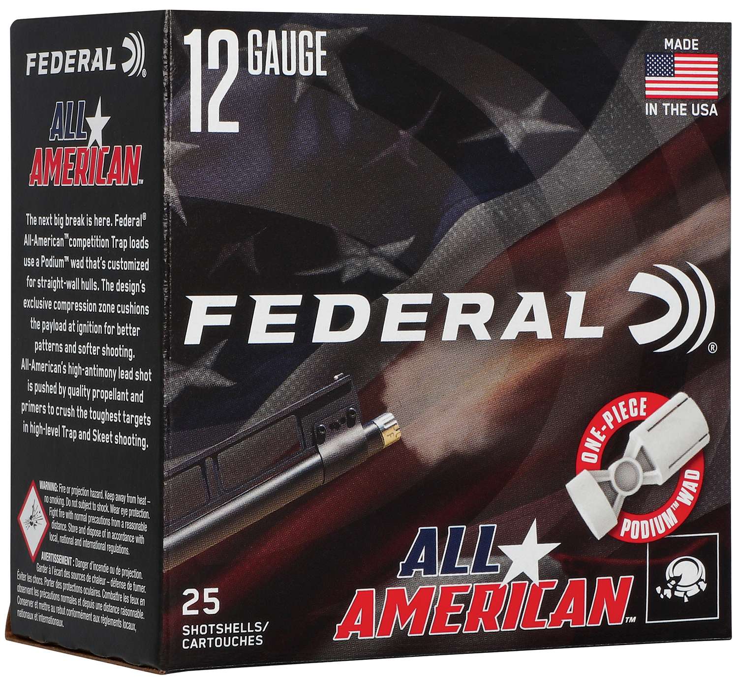 Federal All-American 12 Gauge 2-3/4 Inch ammunition is engineered to win competition Trap events with a Podium wad that’s customized for straight-wall hulls. The design’s exclusive compression zone cushions the 1 Ounce payload at ignition for softer shooting. High-antimony lead pellets in Number 7.5 Shot strike the perfect balance of hardness and density, providing the energy needed to break distant clays while resisting deformation and maintaining pattern efficiency. Pushed by Federal’s high-quality propellant and legendary primers, All-American crushes the toughest targets in high-level Trap and Skeet shooting. Each box contains 25 rounds.