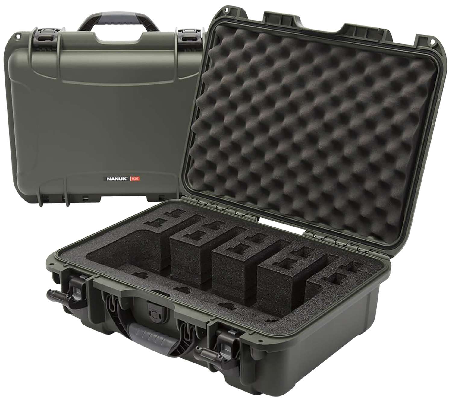 Nanuk 925 4 Up waterproof pistol case holds up to 4 handguns with closed-cell foam padding and dual locking eyelets for secure transport. Olive finish with interior capacity for 10 magazines and accommodation for trigger-locked firearms.