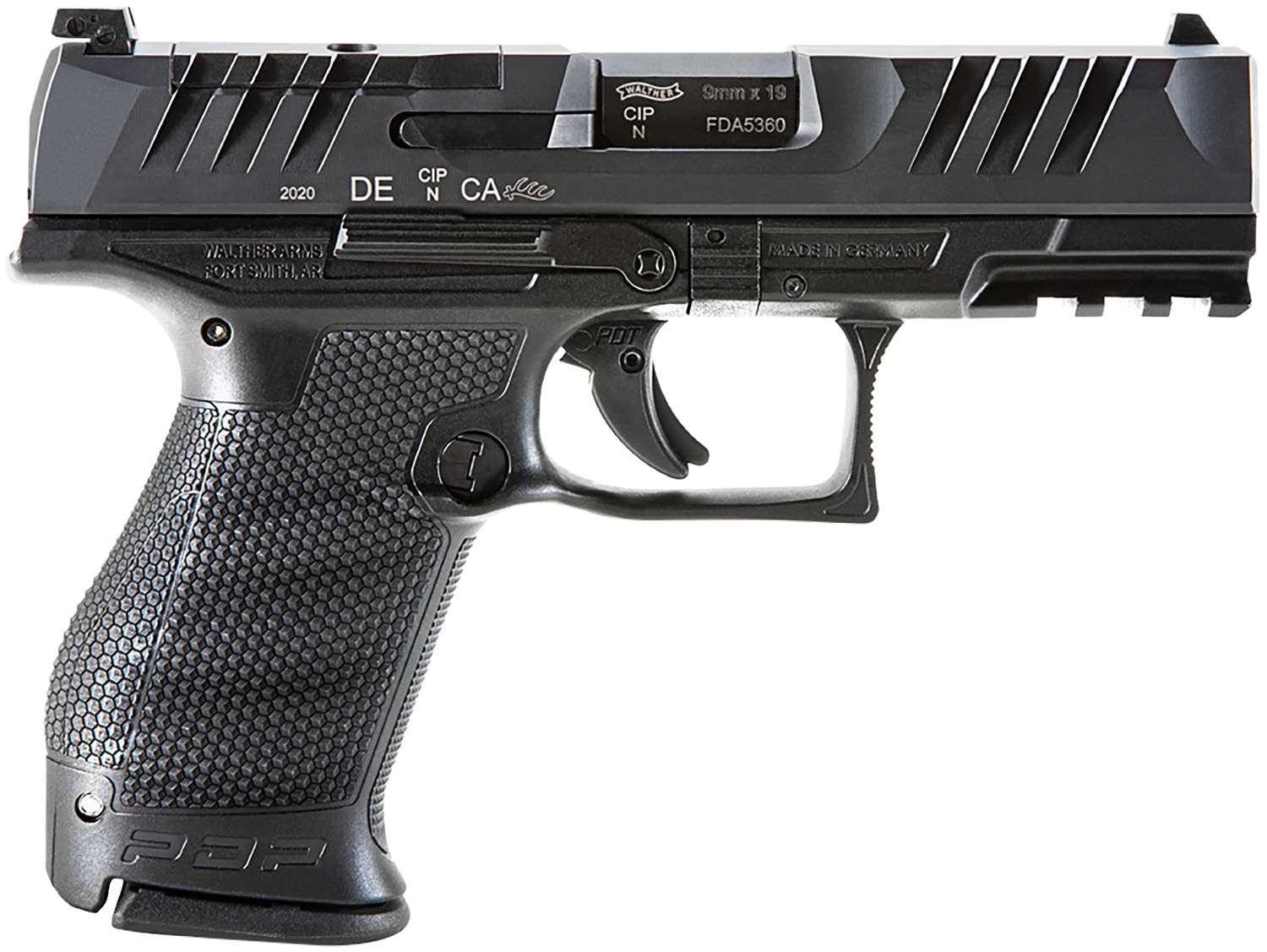 The Walther PDP handgun is for whether you are on the job or with the family. Featuring revolutionary ergonomics, SuperTerrain Slide Serrations and a Performance Duty Trigger. The SuperTerrain Serrations are uniquely designed protruding serrations on the slide, allowing for quicker and more responsive hands-on engagement with the pistol. Performance Duty Texture provides an aggressive surface to maintain proper grip performance. With its tetrahedron design, it is non-abrasive so there will be no irritation to the skin or clothing of the user. Includes two magazines.