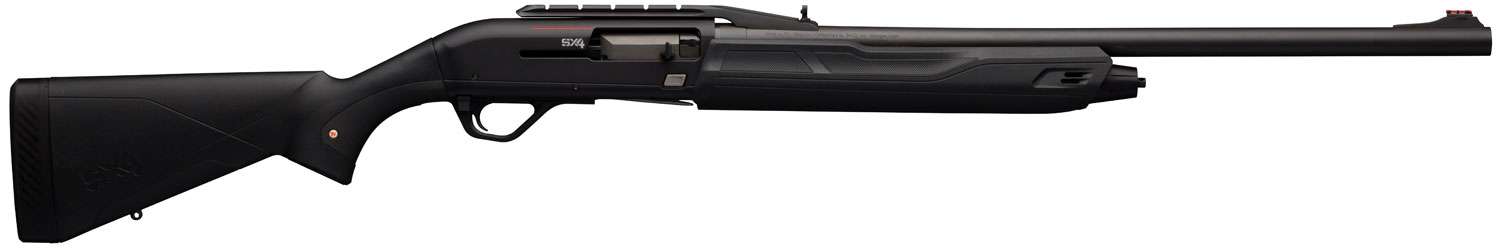 Winchester SX4 semi-auto 12 gauge with 22″ rifled barrel and factory cantilever rail for optics mounting—purpose-built for slug-hunting accuracy. Black synthetic stock and matte finish deliver rugged reliability with TruGlo fiber optic sights included.