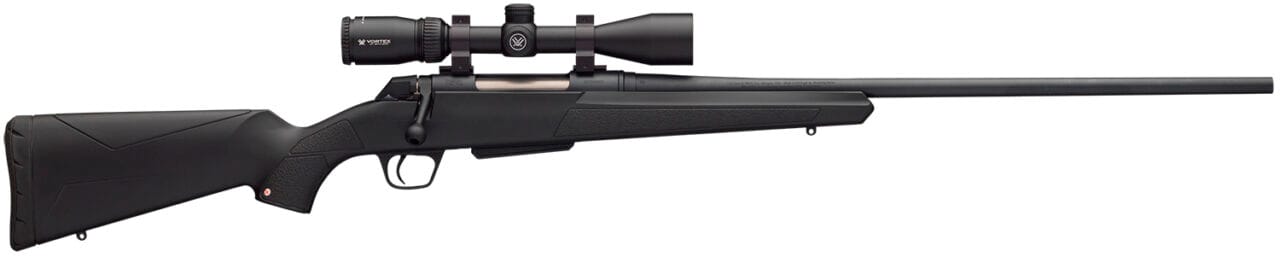 The Winchester XPR is a straightforward, dependable hunting rifle built to deliver consistent performance season after season. This bolt-action rifle incorporates the M.O.A. Trigger System and a two-position safety with a bolt release button. The one-piece trigger guard and magazine frame design provides a spacious guard opening to accommodate gloved hands. The barrel is button-rifled and free-floating, while the receiver comes drilled and tapped for optics mounting. A synthetic stock fitted with Inflex Technology recoil pad and a detachable single stack box magazine complete the build. The rifle ships with a Vortex Crossfire 3-9×40 scope featuring a BDC reticle, along with Weaver rings and bases.